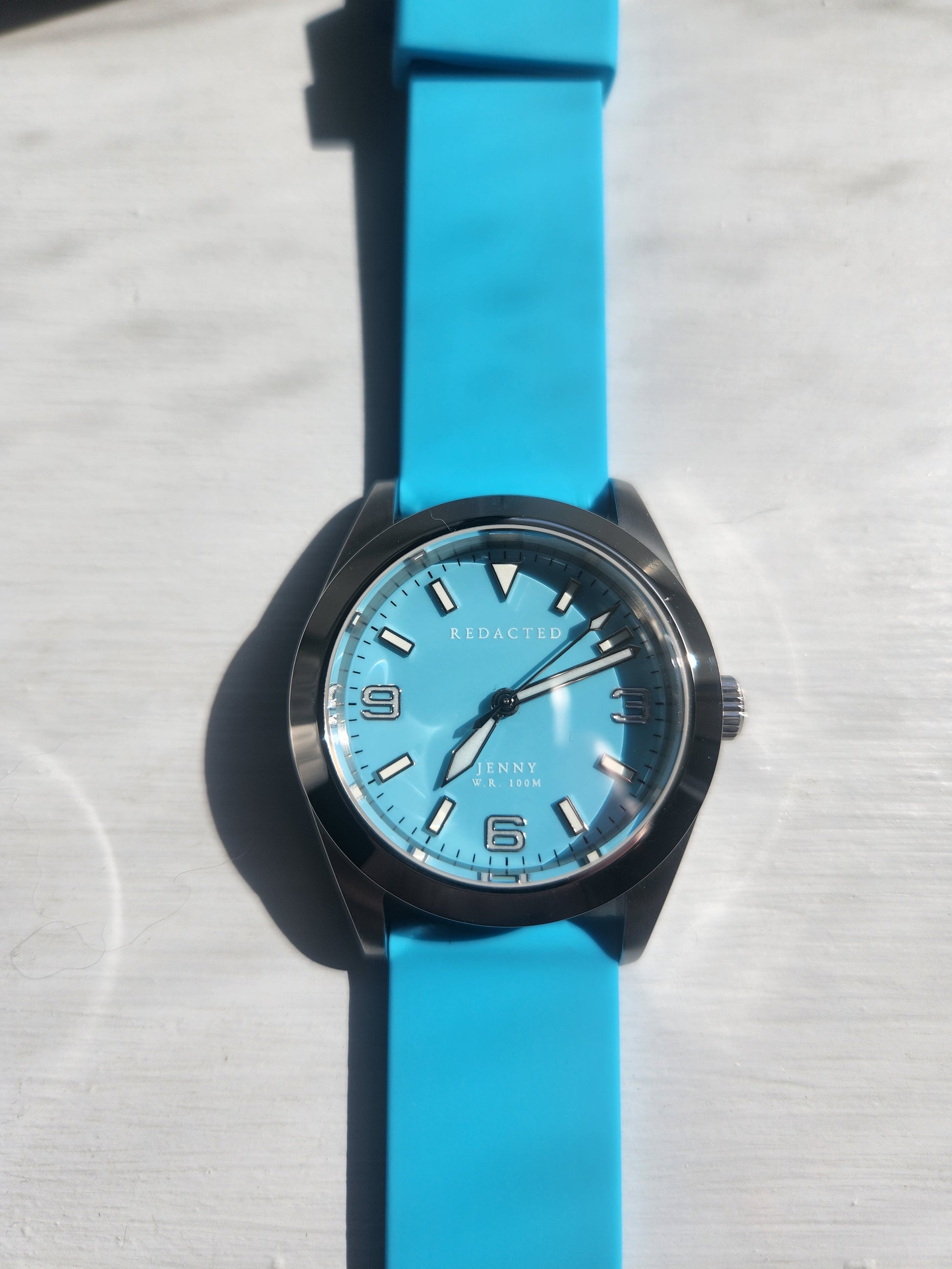Each JENNY ships with a stainless steel Jubilee bracelet for a classic, polished look, and an aqua blue silicone strap that adds a soft, modern pop of color. The strap is breathable, flexible, and perfect for warm weather or casual wear. Additional spring bars are included for quick and easy swaps.